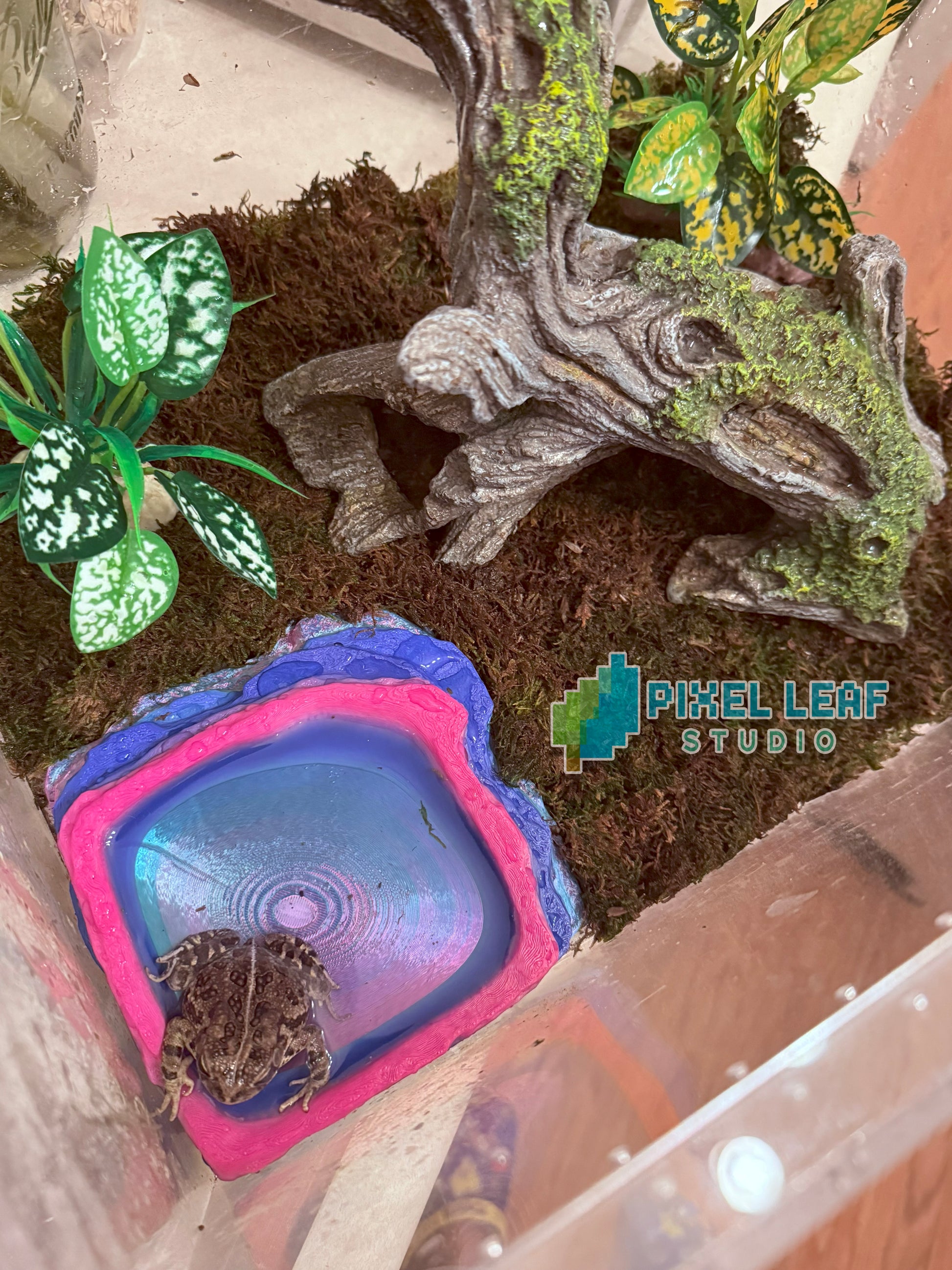 Bring color and function to your terrarium with this unique 3D printed water dish! Designed with a natural rock-like layered aesthetic and printed in vibrant gradient colors, this dish is both practical and eye-catching. Perfect for frogs, toads, lizards, and other small terrarium pets, it provides a safe and accessible water source while adding a splash of personality to your setup.